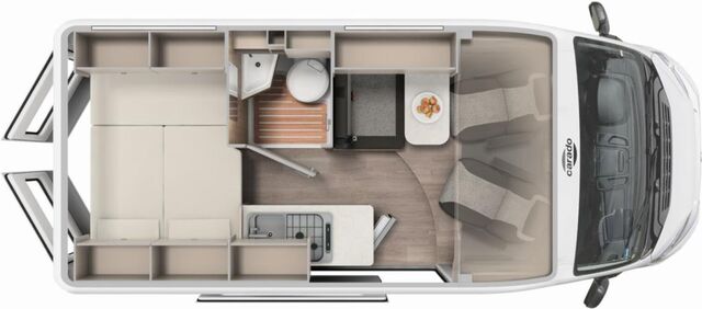 - Basic Paket (Dachhaube Midi Heki 70 x 50 cm über Sitzgruppe, Duschausstattung, Fenster im Bad, Kleiderstange in der Nasszelle, Breite Einstiegsstufe, Drehplatte für Tischerweiterung an der Sitzgruppe)